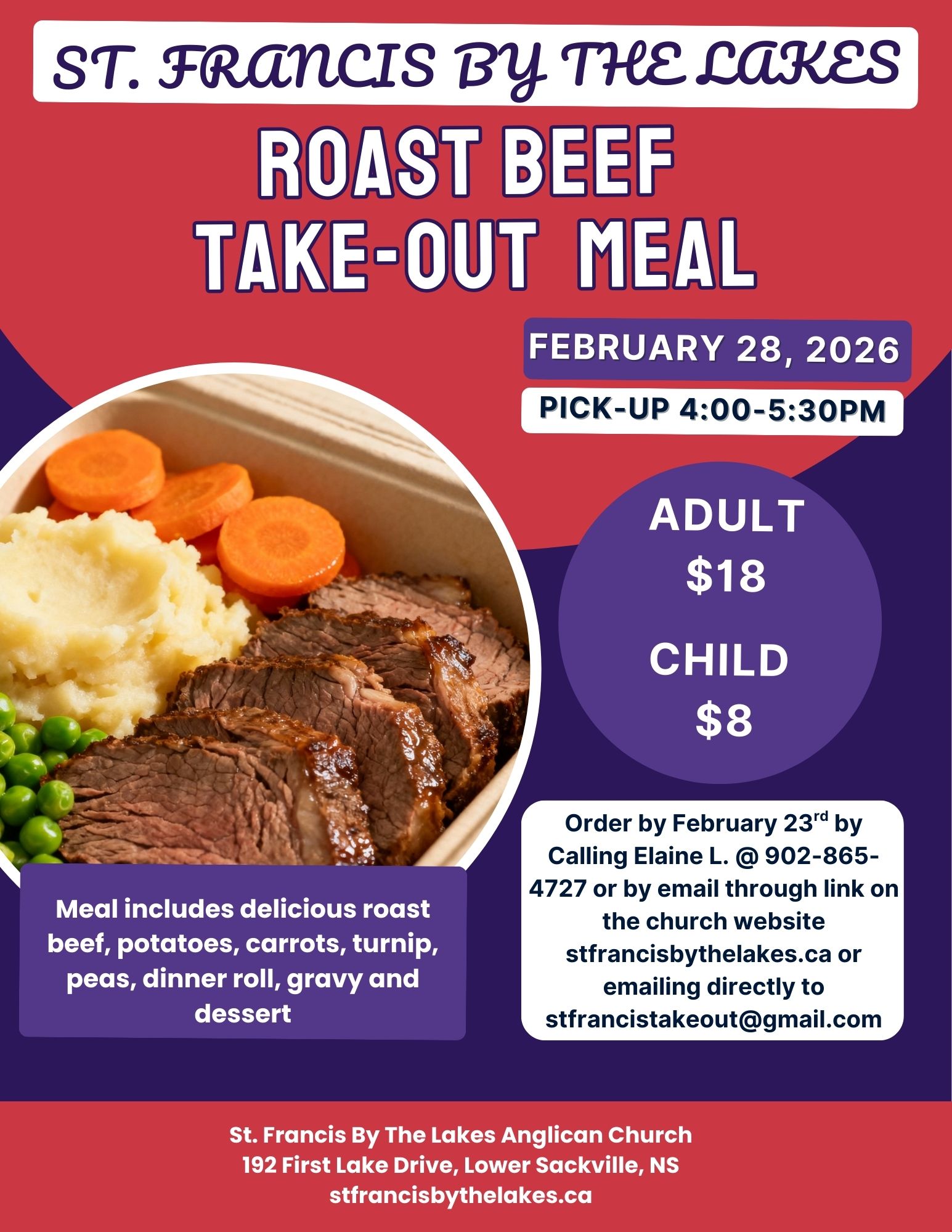 Our February TakeāOut is a Roast Beef Supper. Please see the poster below for details. You can place your order by calling Elaine Laurie (902-865-4727) or by emailing us through this link